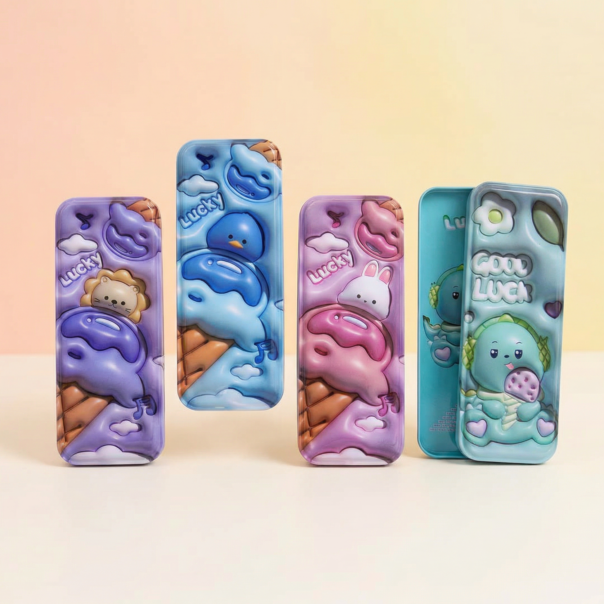 Features cute 3D embossed animal designs, including lion, bunny, and dinosaur characters with "Lucky" text. The durable tin construction protects your pens, pencils, and small accessories while adding a pop of pastel color to your desk.